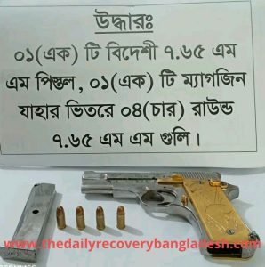 Kawsher Tusher (Publisher & Editor – The Daily Recovery Bangladesh – https://www.facebook.com/profile.php?id=61580276518900)  – বাংলাদেশ এর খুলনা বিভাগ এর – খুলনা জেলা’র – সিটি কর্পোরেশন এলাকা’য় – খুলনা মেট্রোপলিটন পুলিশ (কেএমপি)’র – সোনাডাঙ্গা মডেল থানা – কর্তৃক অভিযানে – ০১’টি অবৈধ বিদেশী পিস্তল, ম্যাগাজিন এর ভিতরে ০৪ রাউন্ড গুলি, ০১’টি Suzuki Gixxer মোটর’সাইকেল উদ্ধার হয়েছে – ১০ – ০৪ – ২০২৬ ইংরেজি তারিখে – হাজী ইসমাইল রোড’স্থ চশমা’ওয়ালা’র মোড় হইতে পল্লী’মঙ্গল স্কুল সংলগ্ন পল্লী’মঙ্গল জামে মসজিদ এর সামনে হতে, পরবর্তী’তে অজ্ঞাত’নাম’সমূহে – সন্ত্রাস এর কার্য্যক্রম সংঘটন এর উদ্দেশ্যে’য় – বিদেশী অস্ত্র অবৈধ’ভাবে হেফাজতে রাখিয়া – (19 A The Arms Act – 1878 E) ধারা’র অপরাধ করা’র জন্য – সোনাডাঙ্গা মডেল থানা’য় – মামলা দায়ের করা হয়েছে, উক্ত মামলা’র এফআইআর নং – ০৮, তারিখ – ১১ – ০৪ – ২০২৬ ইংরেজি, জি আর নং – ৮২, খুলনা মেট্রোপলিটন পুলিশ (কেএমপি)’র – মিডিয়া সেল জানায় – উক্ত মামলা’র অজ্ঞাত’নাম’সমূহ – এর – আসামি’দের সনাক্ত ও গ্রেফতার অভিযান অব্যাহত রয়েছে।