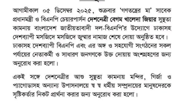 বিজ্ঞপ্তি। বাংলাদেশ এর খুলনা বিভাগ ও জেলা’য় – বাংলাদেশ জাতীয়তাবাদী দল (বিএনপি) এর চেয়ারপার্সন – খালেদা জিয়া’র সুস্হতা’র উদ্দেশে –
